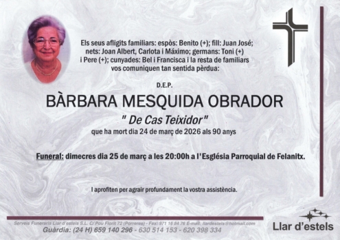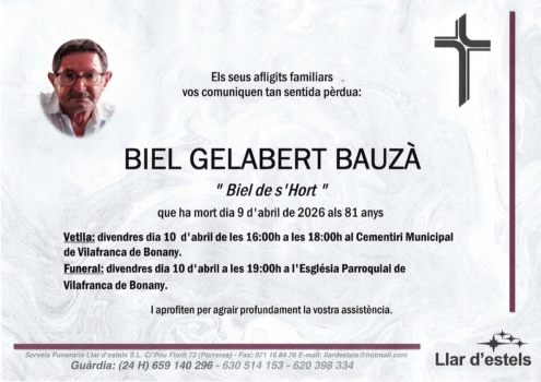 Poden enviar un missatge amb les seves condolències mitjançant l’enllaç que hi ha fent click damunt l’esquela i fer-li arribar via online a la família.
